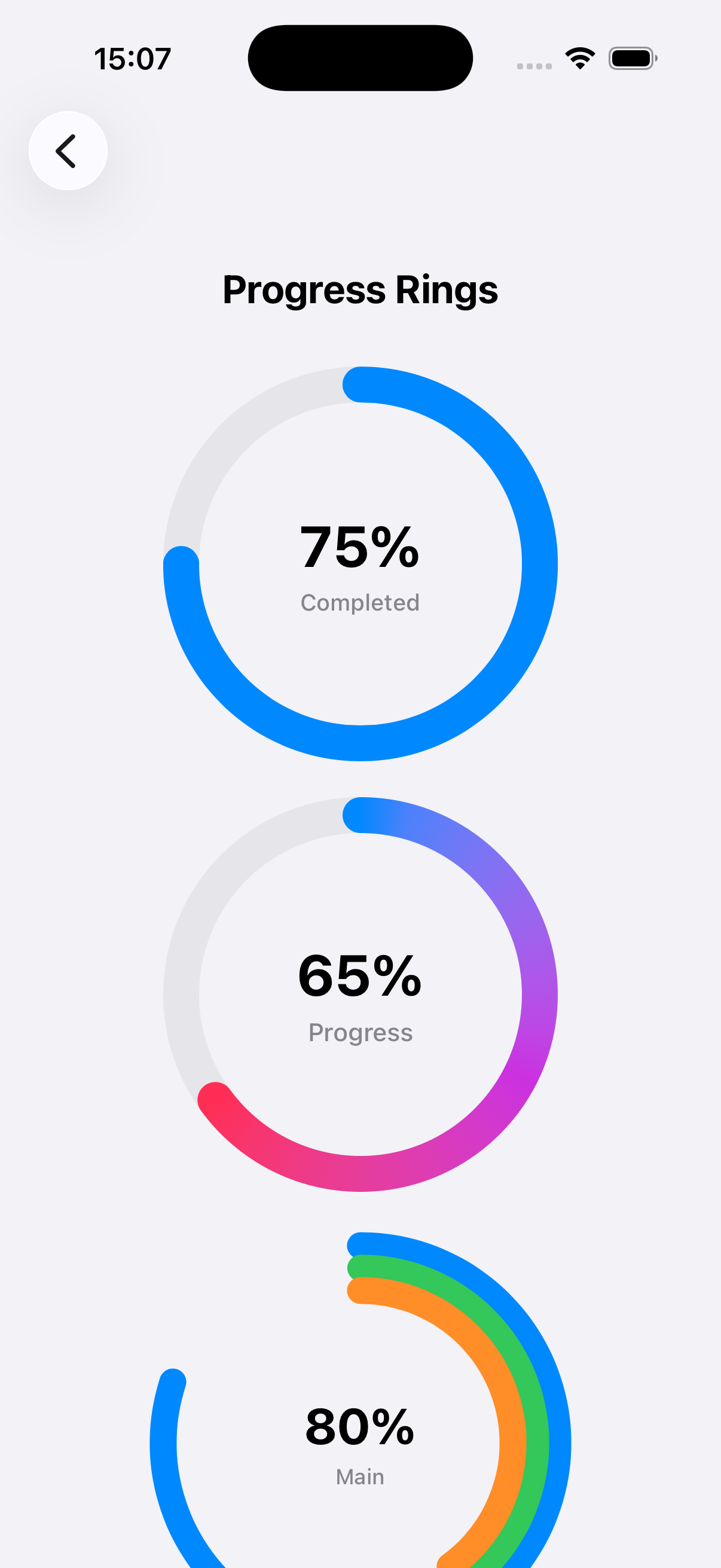 Beautiful circular progress indicators with smooth animations. Includes standard rings, gradient rings, multi-layer rings, segmented rings, and dotted rings. Fully customizable with colors, sizes, line widths, and labels. Perfect for dashboards and progress tracking.